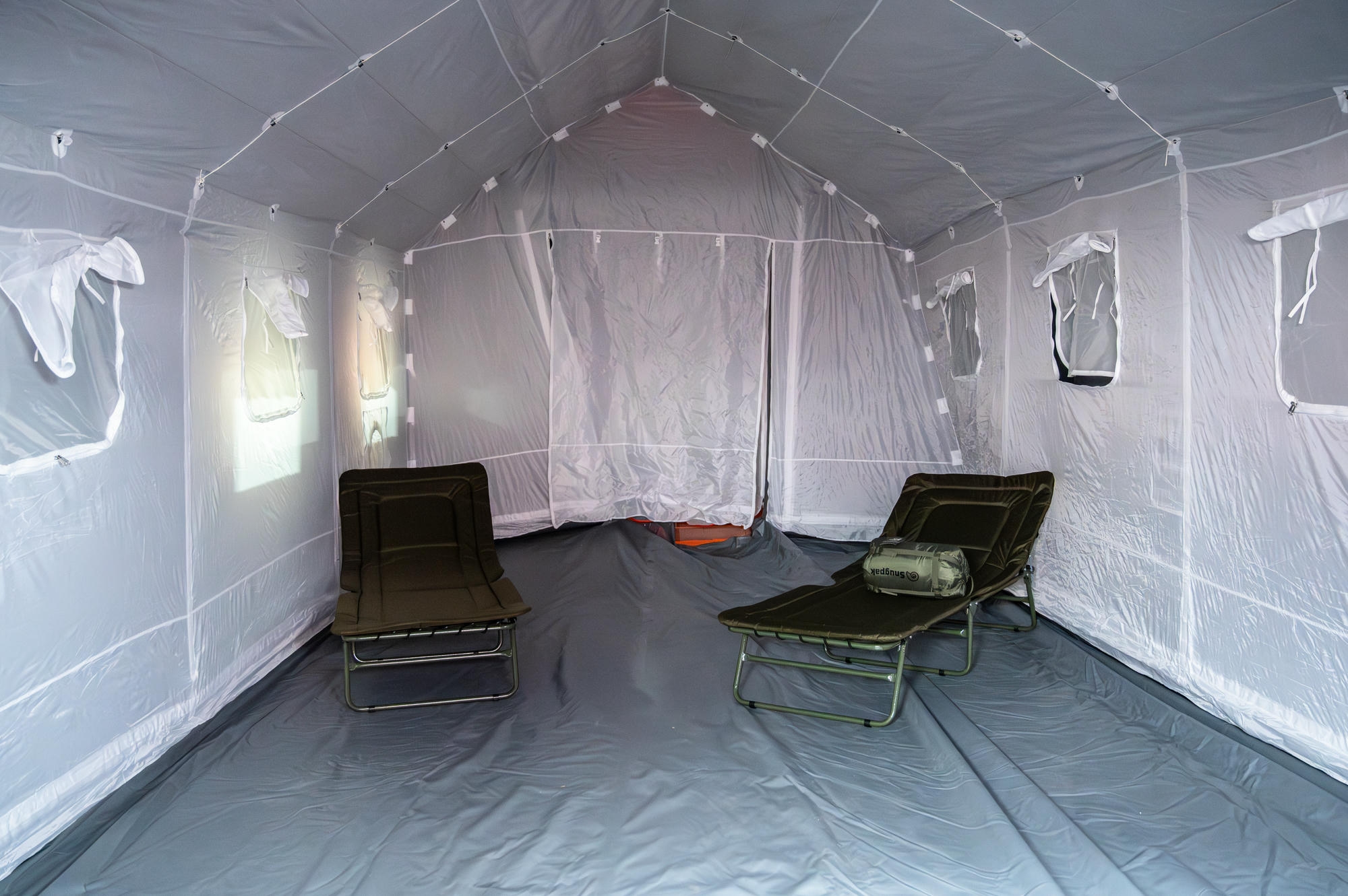 • 2 namioty pneumatyczne 40 m² z wyposażeniem,