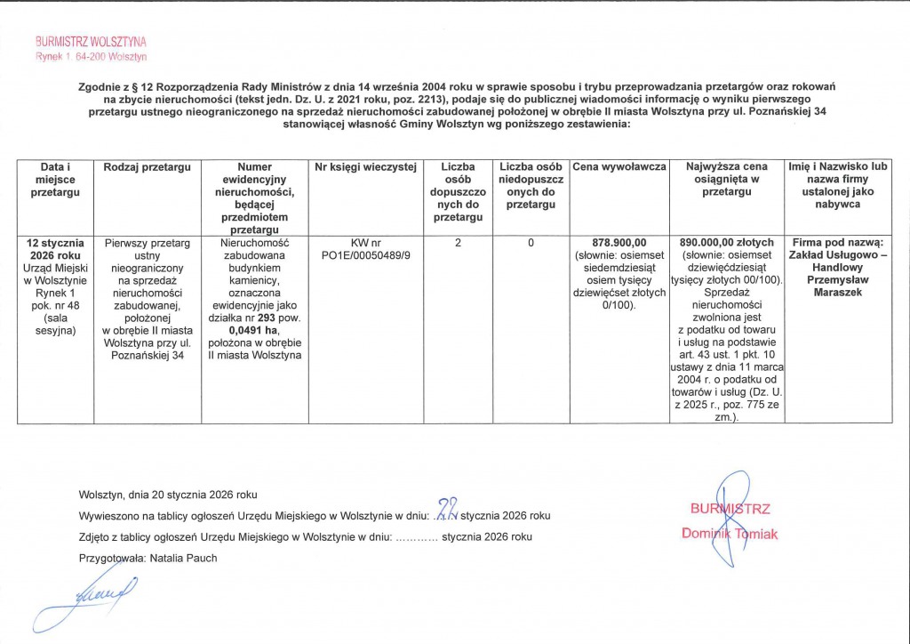 Zgodnie z § 12 Rozporządzenia Rady Ministrów z dnia 14 września 2004 roku w sprawie sposobu i trybu przeprowadzania przetargów oraz rokowań na zbycie nieruchomości (tekst jedn. Dz. U. z 2021 roku, poz. 2213), podaje się do publicznej wiadomości informację o wyniku pierwszego przetargu ustnego nieograniczonego na sprzedaż nieruchomości zabudowanej położonej w obrębie II miasta Wolsztyna przy ul. Poznańskiej 34 stanowiącej własność Gminy Wolsztyn.