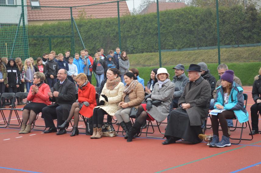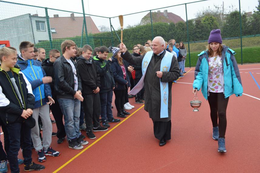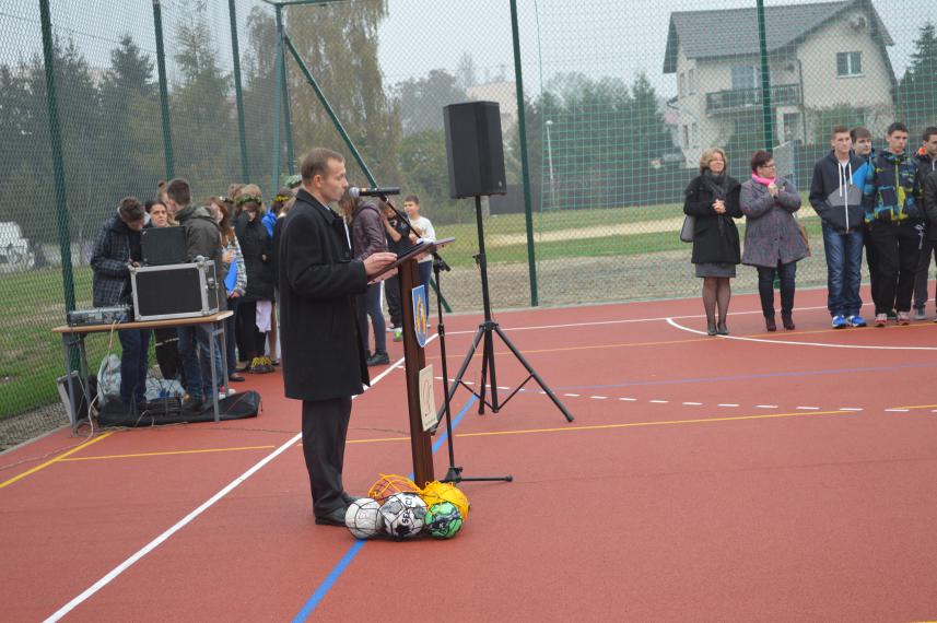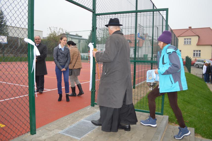 Burmistrz Andrzej Rogozinski przekazał w prezencie zestaw piłek, natomiast Ksiądz Proboszcz Jan Polec poświęcił boisko i pobłogosławił jego użytkowników.