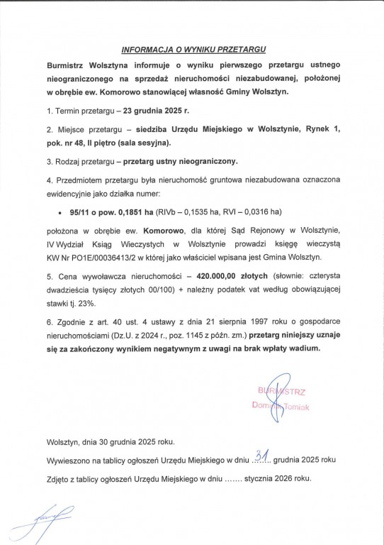 Burmistrz Wolsztyna informuje o wyniku pierwszego przetargu ustnego nieograniczonego na sprzedaż nieruchomości niezabudowanej, położonej w obrębie ew. Komorowo stanowiącej własność Gminy Wolsztyn.