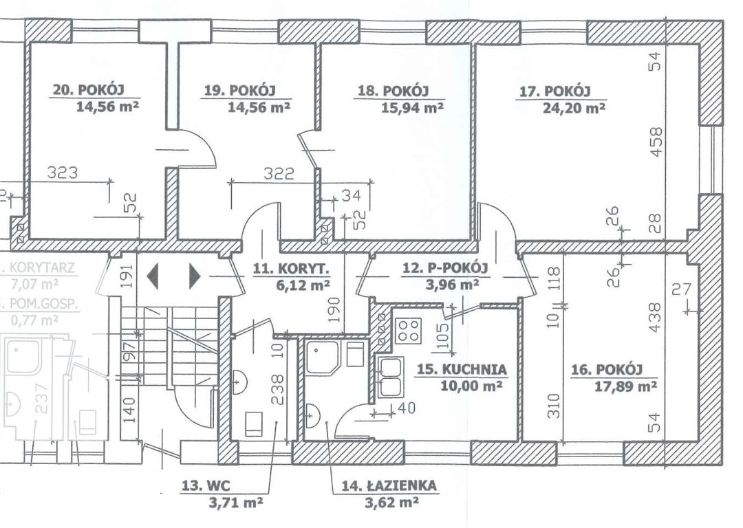 Brak pomieszczeń przynależnych do lokalu. Udział we współwłasności w częściach wspólnych budynku i udział w gruncie wynosi 11456/46296. Wspólne pomieszczenia to klatka schodowa, schody oraz piwnice.